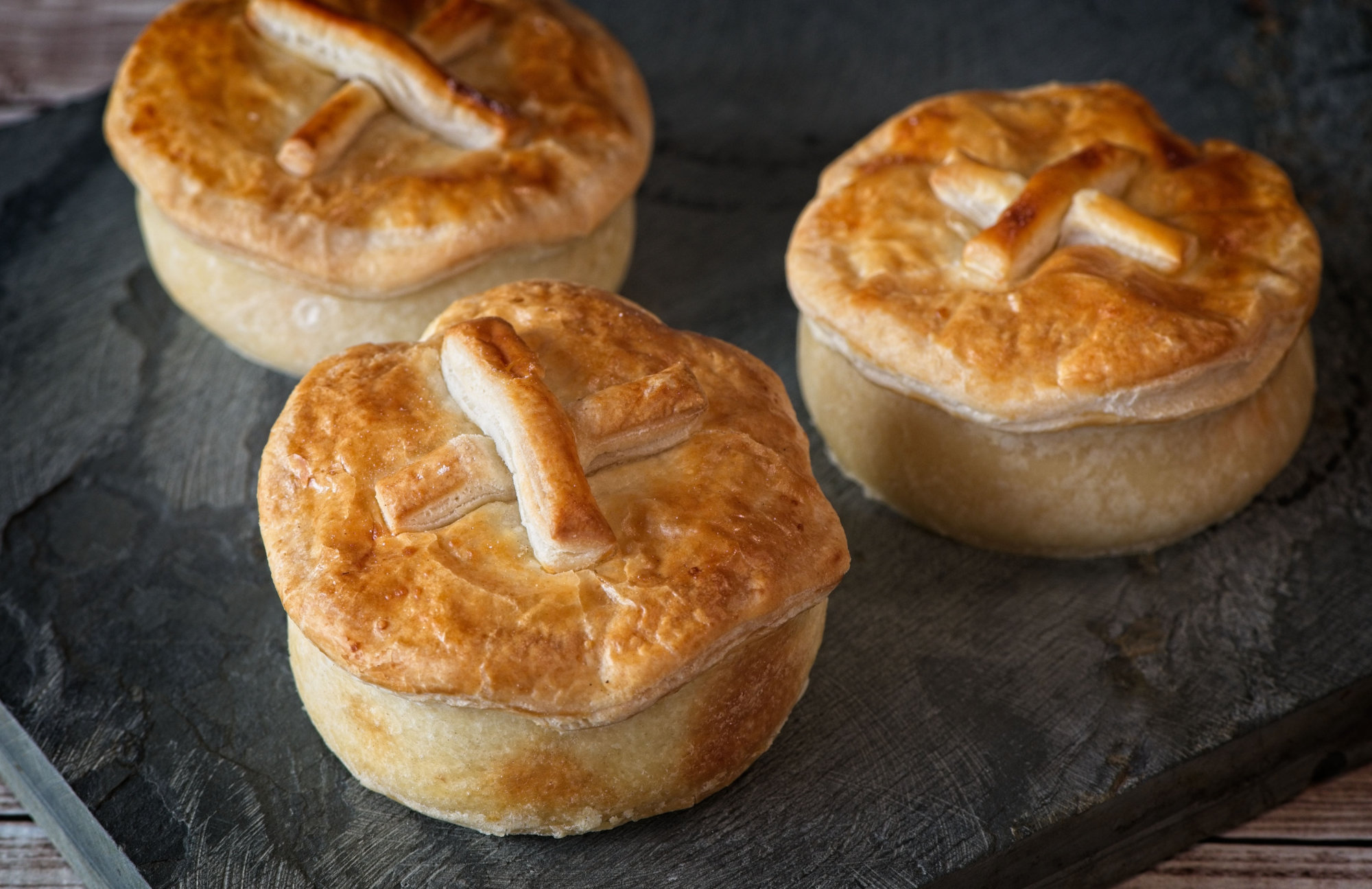 Generous portions of chicken and sliced mushrooms, in a creamy, cheddar cheese sauce encased inside a traditional hot water pastry scotch pie shell.
